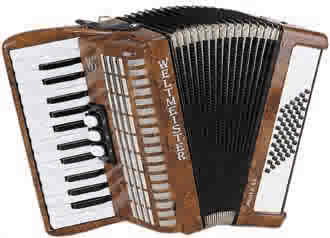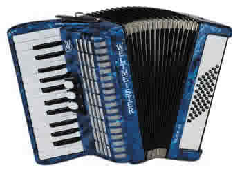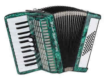 This is our smallest piano keyboard accordion. 26 regular sized keys and 48 basses. Two reed banks for the tremolo and three reed banks for the bass. Two different registers (clarinet and tremolo) but three switches. This instrument is a standard student model, but could also be used by the professional looking for a light weight stage accordion as it provides diminished 7th chords. Includes straps and case.