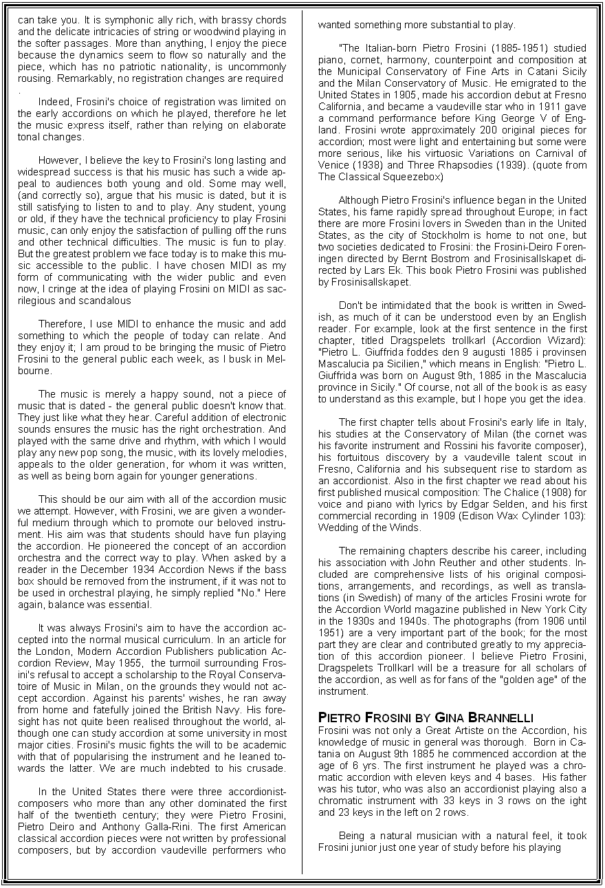Yellow Pages • Gina Brannelli • Personalities • Gina & Romany Rye • Blackpool Acc Club • Club Photos • online articles • Search the Site • accordion info • Cases Charts Info • Used Accordions • Price Lists • Concerto 1 • Dallape • Delicia • Excelsior Main page • Fantini srl • Guerrini • Hohner Home • Paolo Soprani • Piermaria New • Polverini • Scandalli History • Serenellini • Sonatina • Weltmeister Home • Ginas Pupils