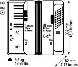 The Rubin is the only instrument of its kind being built in Germany. The physical size and weight is equal to the Perle 26/48. It offers additional 4 keys going down to the low g, which allows for full chords to be played in the right hand. The bass side offers 60 basses covering all keys. Thus this instrument is a favourite of performers that need the full range of tonality but want to cut down on the weight. At the same time this instrument would serve a beginner equally well as it has the traditional size of a beginner model, but also delivering enough tone range that the beginner could learn for 2-3 years. A great beginning instrument for longevity. For more information Telephone 01253 822046
