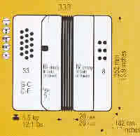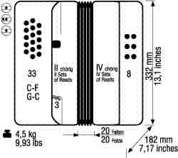 33 treble buttons and 8 bass buttons. Large bellow with 20 folds. Other